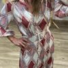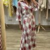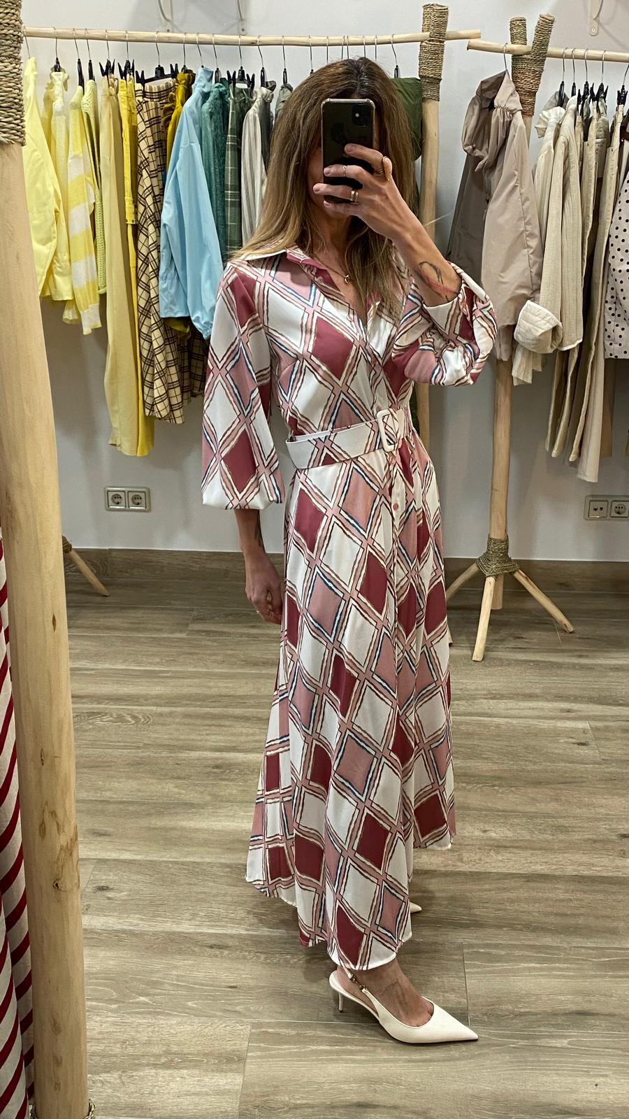 Vestido largo de corte fluido con estampado geométrico en tonos rosados y neutros, ideal para looks elegantes sin esfuerzo ✨