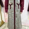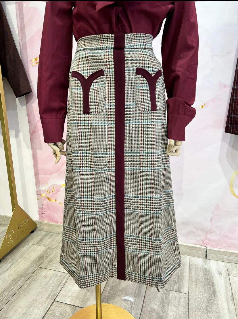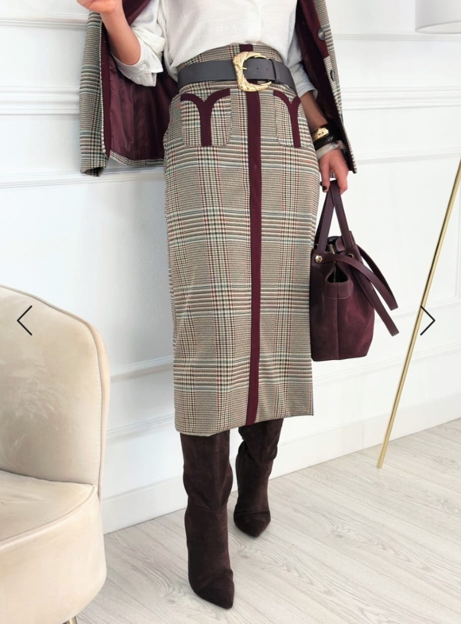 Falda lápiz de cuadros príncipe de Gales con detalle central en burdeos 🍷 y bolsillos decorativos. Cierre trasero, corte entallado y largo midi elegante ✨. Perfecta para llevar con botas altas o tacón y marcar cintura con un cinturón llamativo.